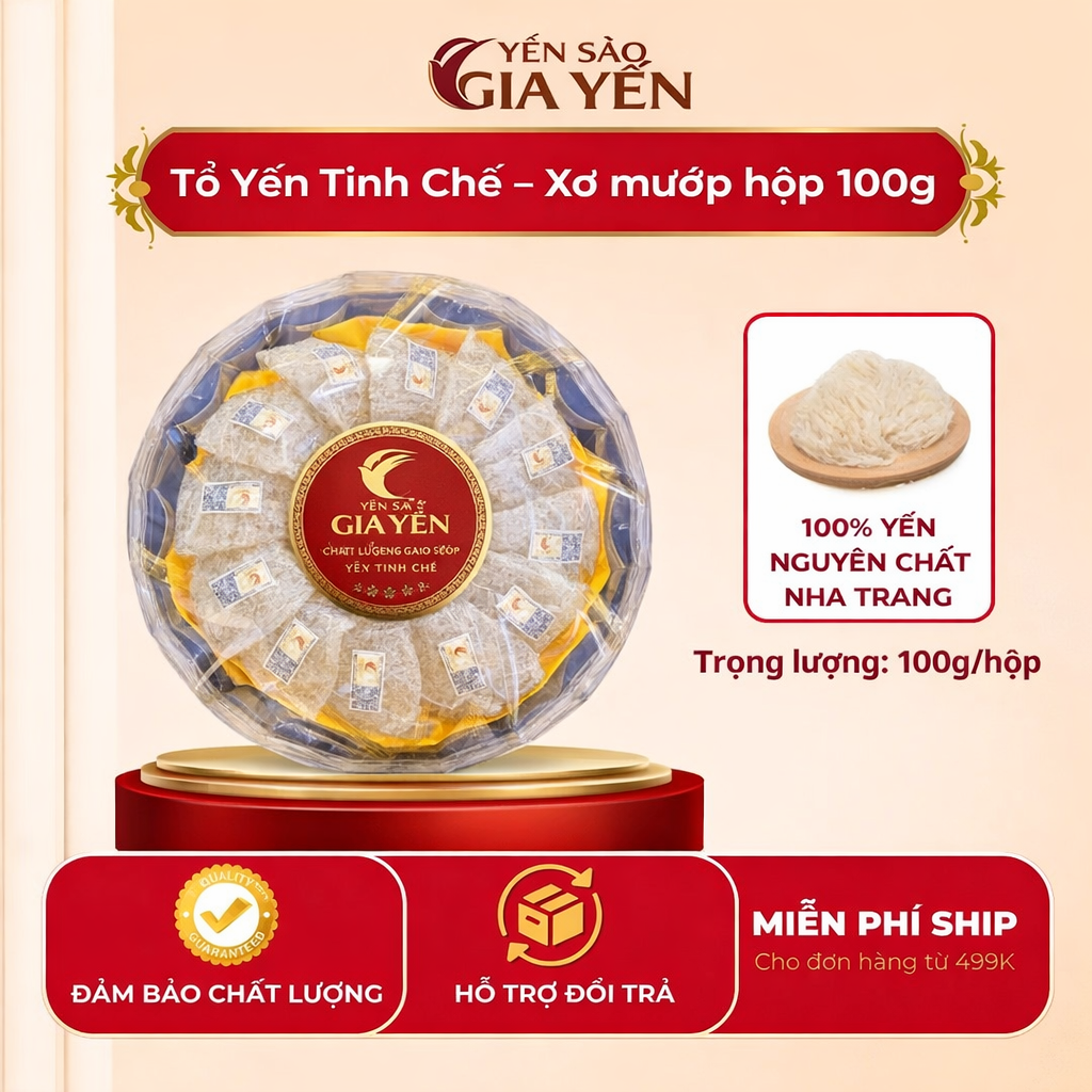Tổ Yến Tinh Chế – Xơ Mướp Hộp 100g Gia Yến là dòng sản phẩm cao cấp được tuyển chọn từ yến sào Nha Trang nguyên chất 100%, trải qua quy trình làm sạch thủ công tỉ mỉ, giữ nguyên giá trị dinh dưỡng tự nhiên.
