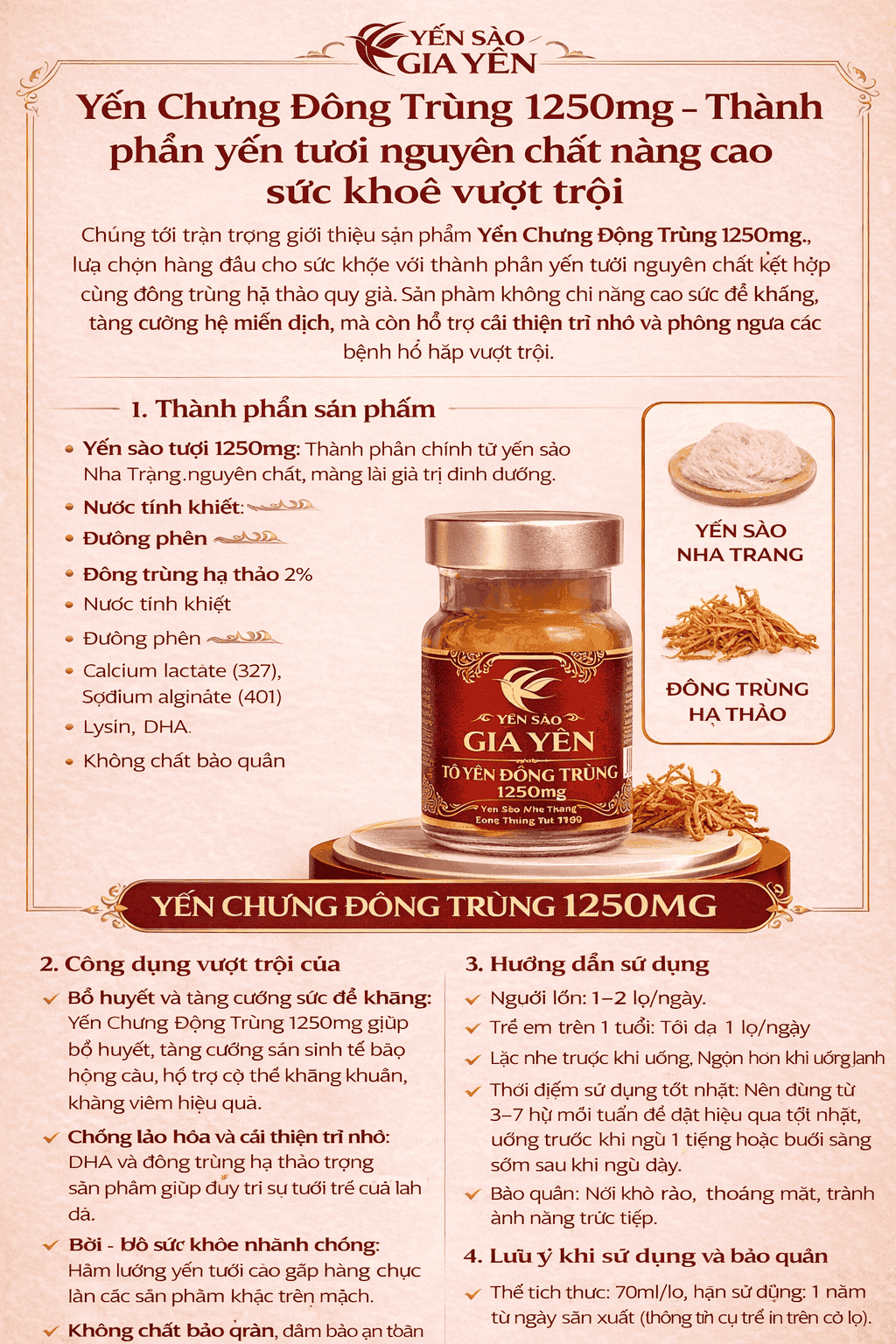 • Thành phần: 100% Yến sào nguyên chất (1250mg/hũ), đông trùng hạ thảo